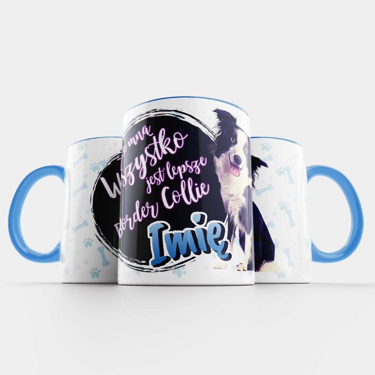 Kubek z psem Border Collie z napisem „ze mną wszystko jest lepsze” oraz możliwością dopisania własnego imienia/ksywki.