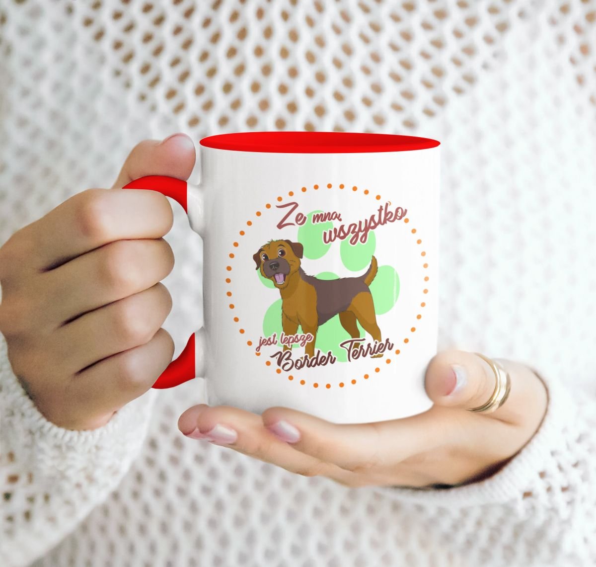 Kubek z psem Border terrier z napisem „ze mną wszystko jest lepsze” oraz możliwością dopisania własnego imienia/ksywki.