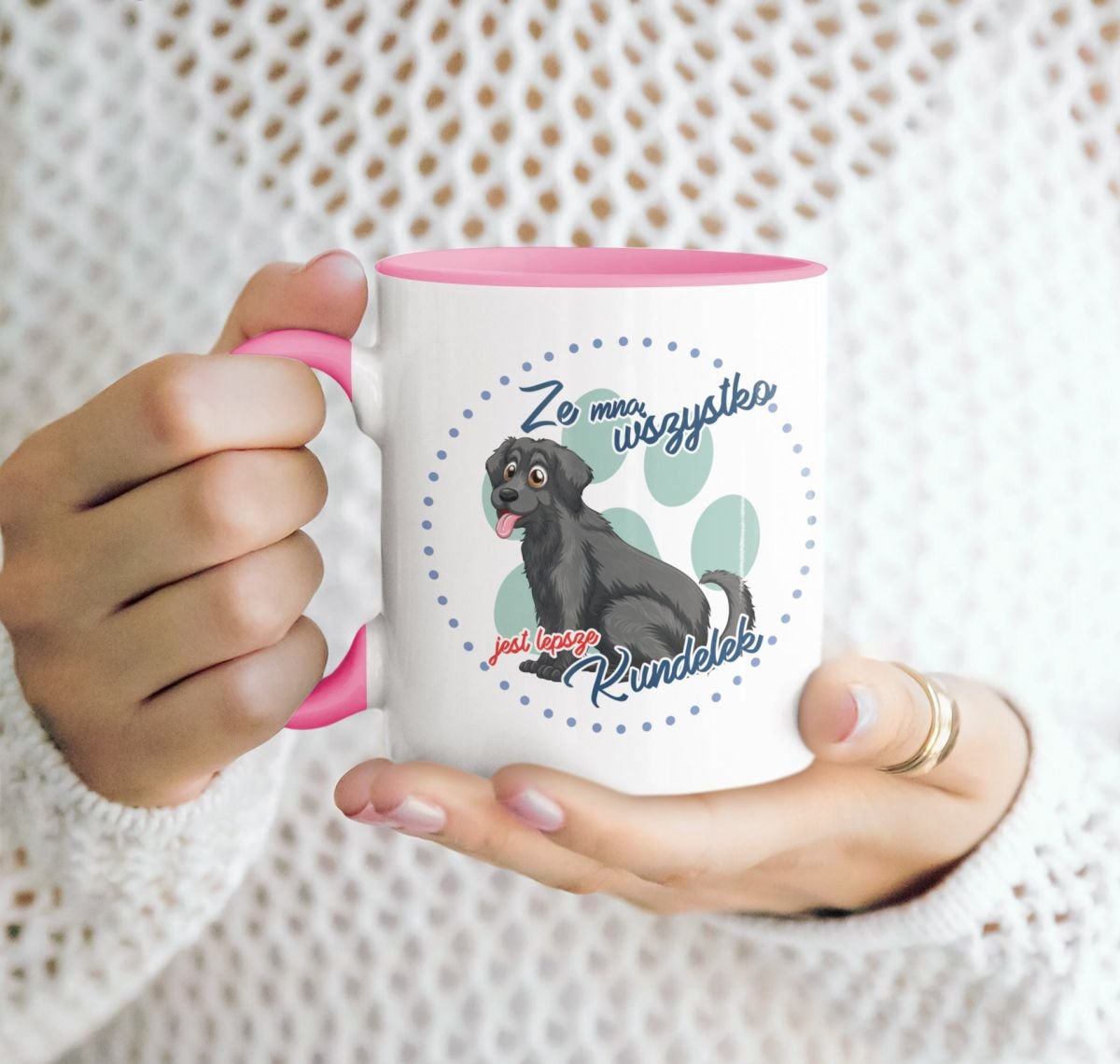Kubek z psem Kundelek z napisem „ze mną wszystko jest lepsze” oraz możliwością dopisania własnego imienia/ksywki.