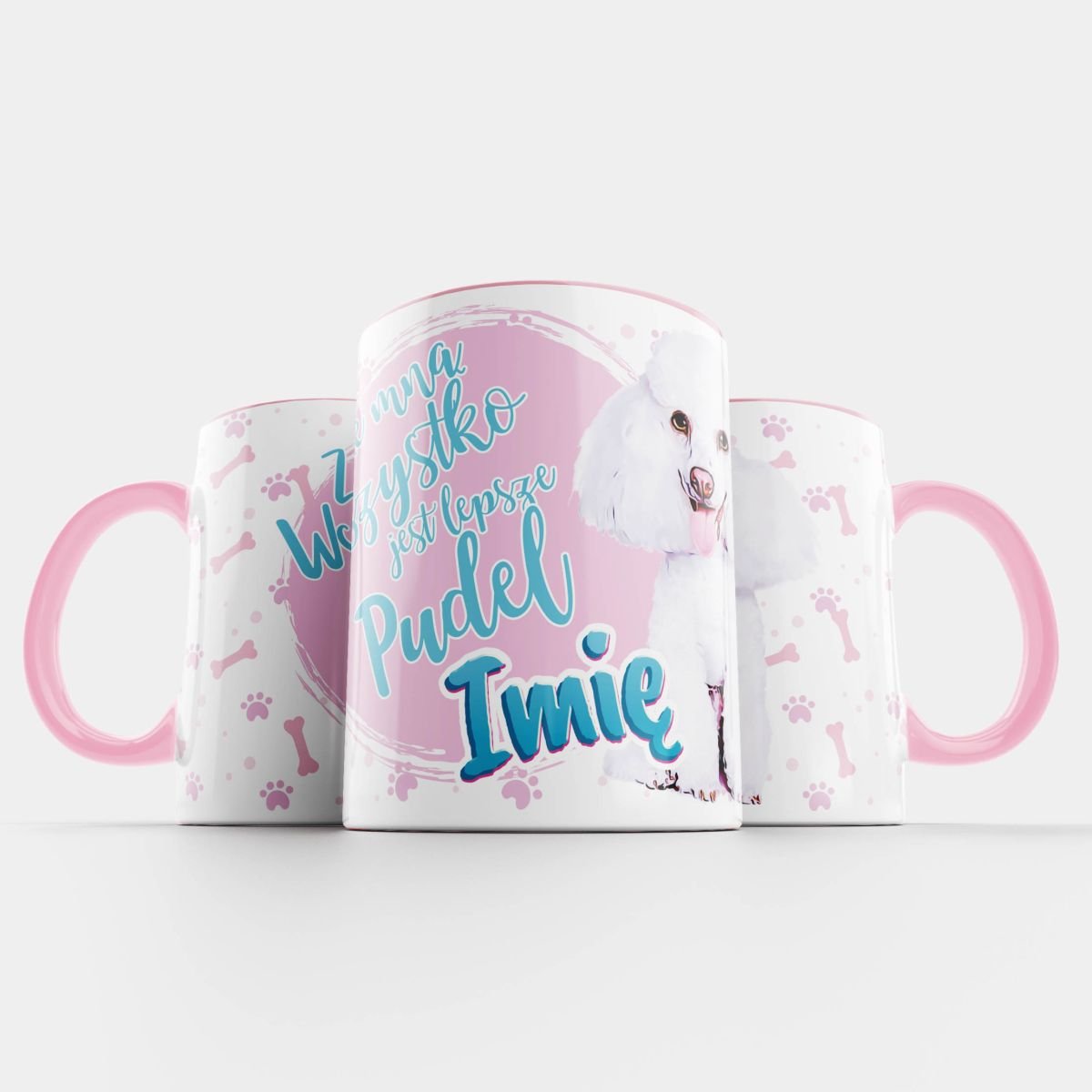 Kubek z psem Pudel z napisem „ze mną wszystko jest lepsze” oraz możliwością dopisania własnego imienia/ksywki.