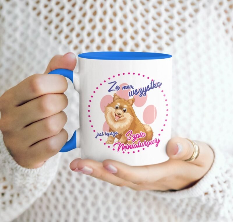Kubek z psem Szpic miniaturowy z napisem „ze mną wszystko jest lepsze” oraz możliwością dopisania własnego imienia/ksywki.